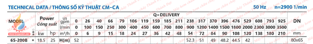 Bảng thông số kỹ thuật của bơm chữa cháy điện trục rời INTER CA65-200B 25HP 18.5KW