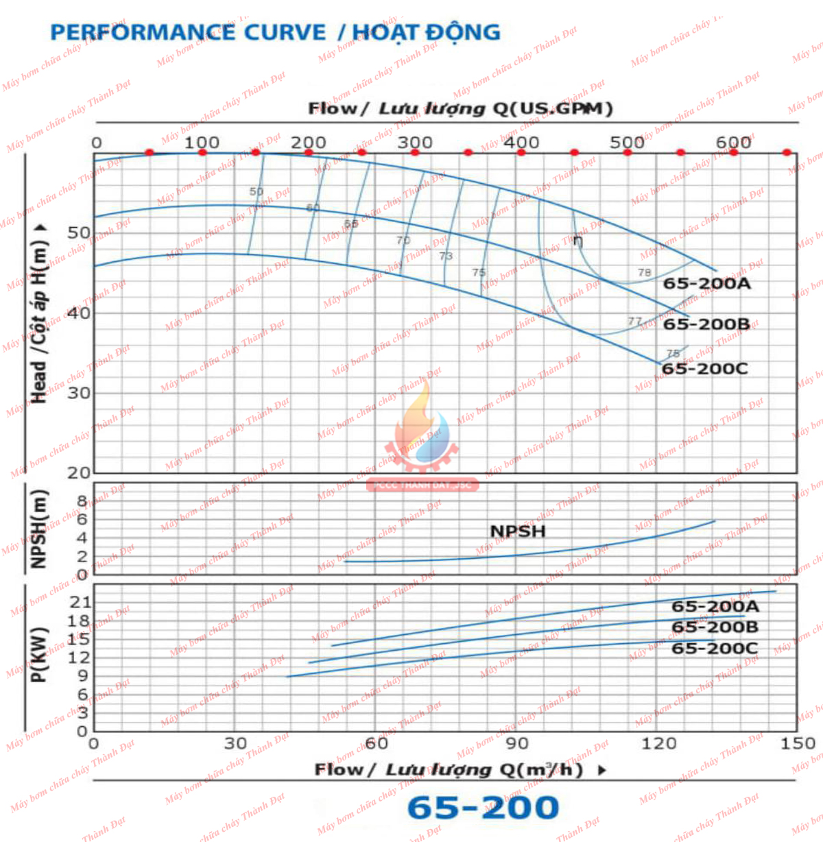 Bảng biểu đồ lưu lượng cột áp của bơm chữa cháy điện trục rời INTER CA65-200B 25HP 18.5KW