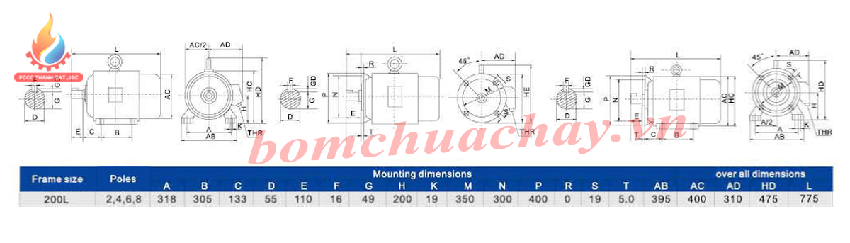 Bảng thông số kích thước của động cơ Vicky VY-200L2-2