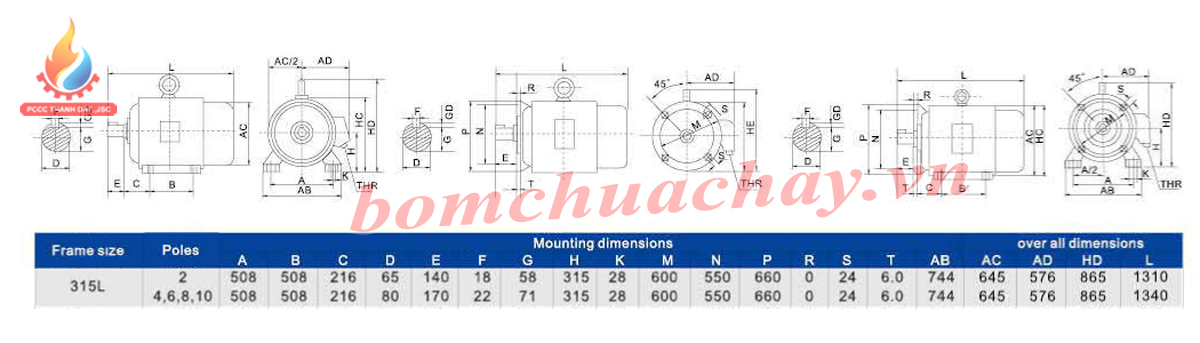 Bảng thông số kích thước của động cơ Vicky VY-315L2-2