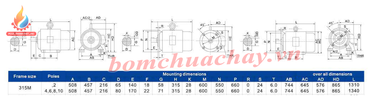 Bảng thông số kích thước của động cơ Vicky VY-315M-2