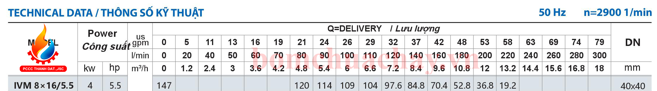 Bảng thông số kỹ thuật của máy bơm bù áp Inter IVM 8×16 5.5HP