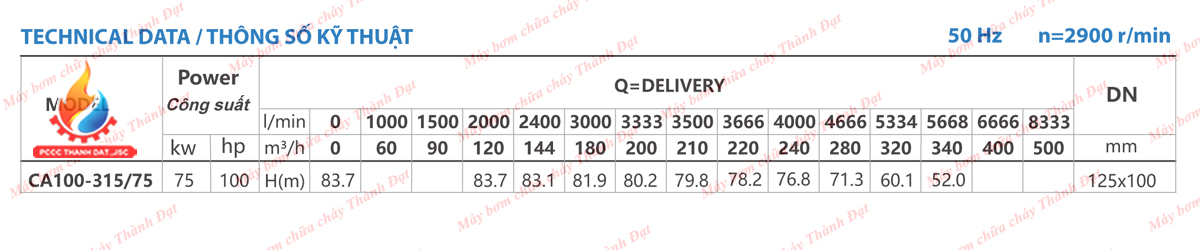 Bảng thông số kỹ thuật của bơm chữa cháy điện trục rời INTER CA100-315/75 100HP 75KW