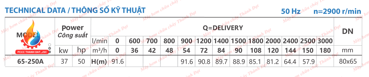 Bảng thông số kỹ thuật của bơm chữa cháy điện trục rời INTER CA65-250A 50HP 37KW