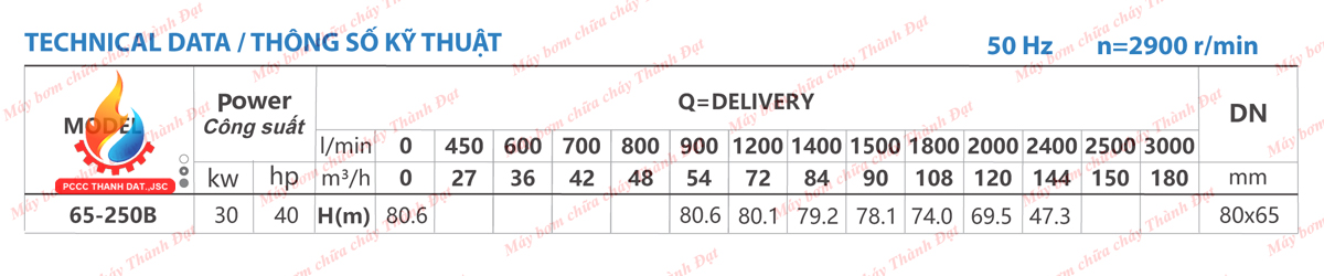 Bảng thông số kỹ thuật của bơm chữa cháy diesel INTER CA65-250B 40HP 30KW