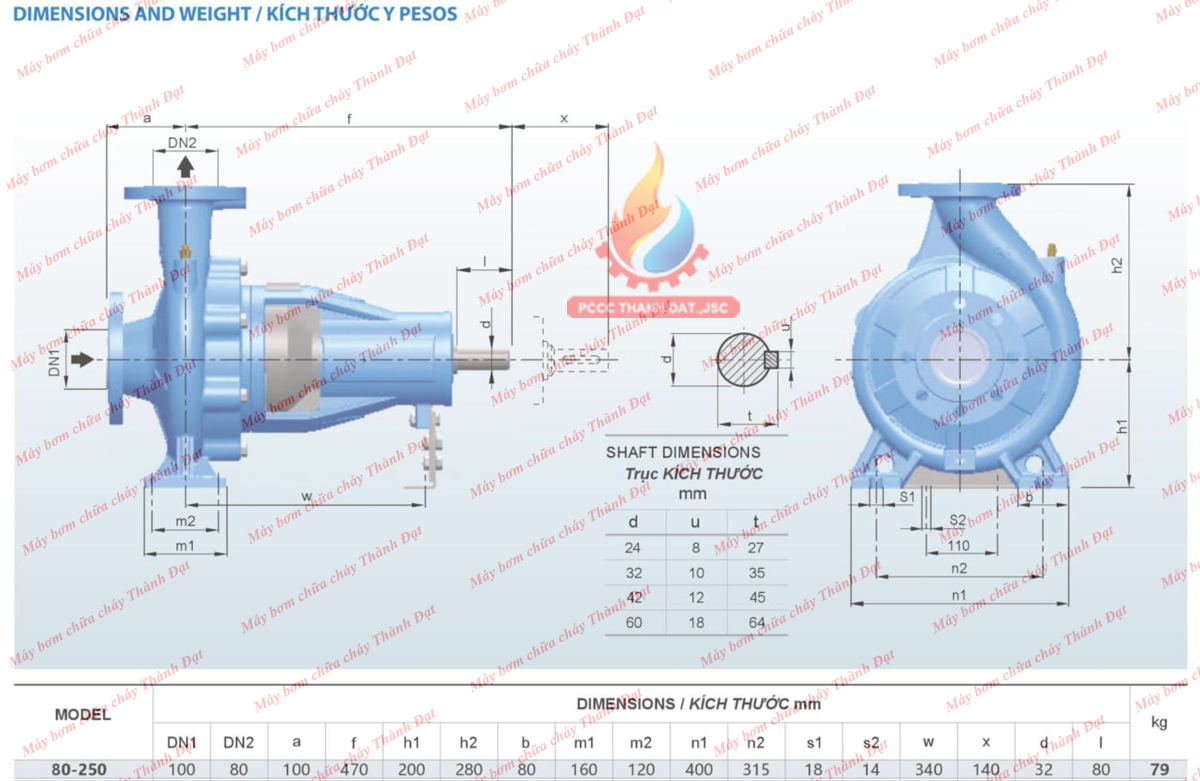Bảng thông số kích thước của bơm chữa cháy điện trục rời INTER CA80-250/37 50HP 37KW