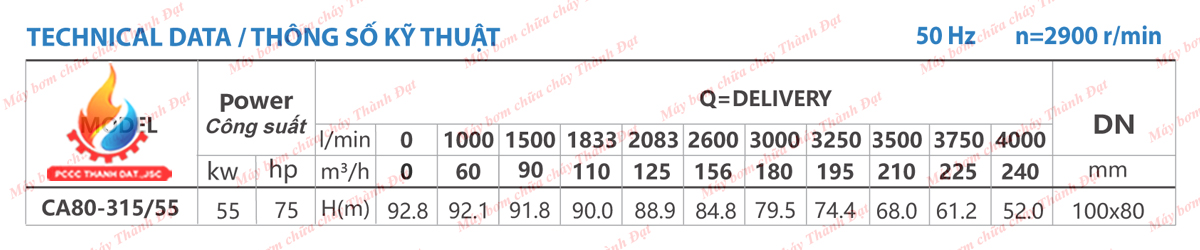 Bảng thông số kỹ thuật của bơm chữa cháy điện trục rời INTER CA80-315/55 75HP 55KW