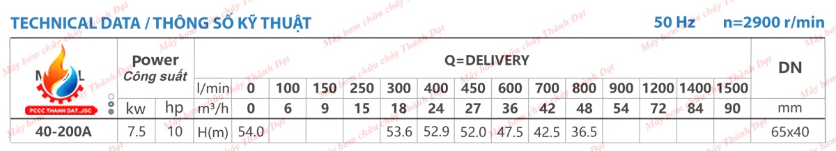 Bảng thông số kỹ thuật của bơm chữa cháy diesel INTER CA40-200A 10HP 7.5KW