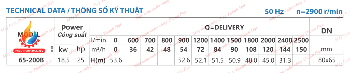 Bảng thông số kỹ thuật của bơm chữa cháy diesel INTER CA65-200B 25HP 18.5KW